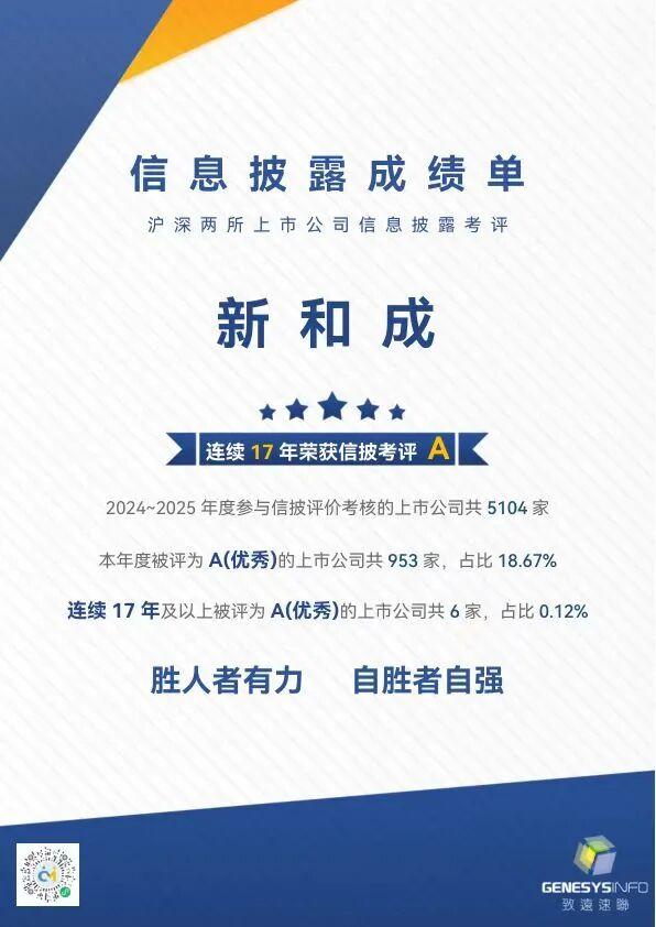 近日,深圳證券交易所公布了深市上市公司2024~2025年度信息披露考評結(jié)果,新和成以整體運(yùn)作規(guī)范、高質(zhì)量的信息披露再次獲得最高評級A。目前,僅有6家上市公司連續(xù)17年獲此殊榮,占比0.12%,新和成位列其中。這一成績不僅彰顯監(jiān)管部門、市場與投資者對新和成信息披露質(zhì)量、公司治理規(guī)范的高度認(rèn)可,更是公司具備長期投資價值的有力印證。
